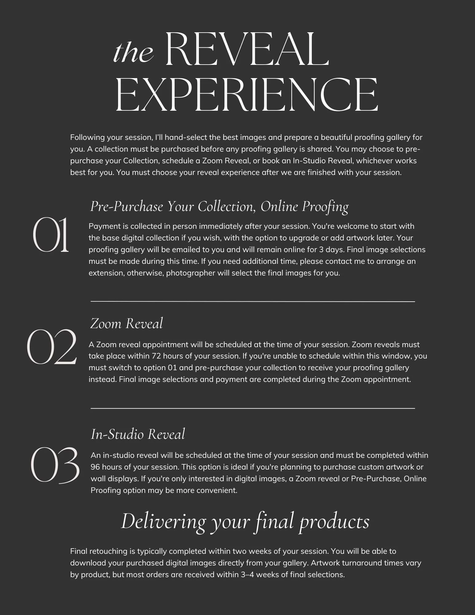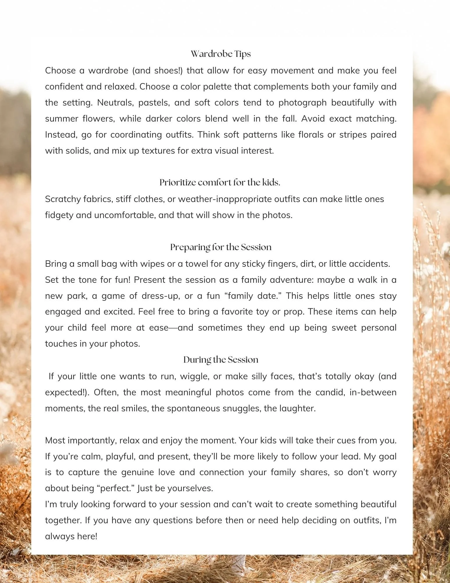 Please tell me who I’ll be photographing. Be sure to include names and ages of any children—this helps me plan and connect with them during the session! (No need to include parent ages.)