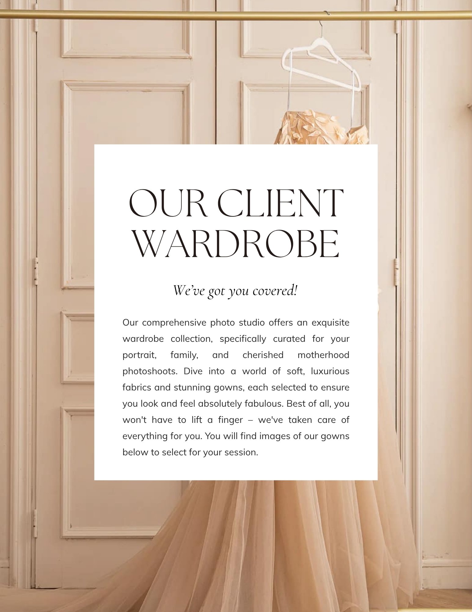 To ensure a perfect day, make sure to check out our session planning guide below. It’s packed with helpful tips to help you prepare for your upcoming photoshoot. You will also see photos of all our dresses and gowns. You can select 3-5 outfits to wear depending on which collection your interested in purchasing after your shoot. Please screenshot the outfit you would like to wear and you can then text or email those to me at 614-361-0861 or email hello@barebabyphotography.com