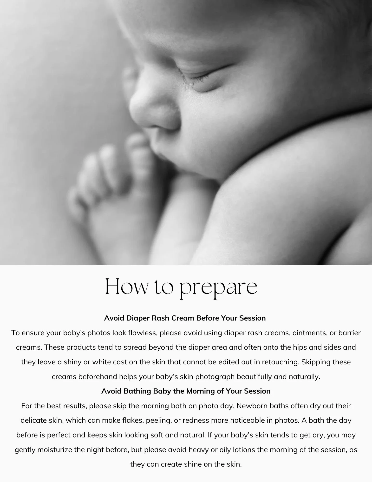 Your newborn session includes setups of just baby as well as family & sibling photos. Sessions consist mostly of baby with a few family photos. Posed newborn sessions include around 4-5 setups of just baby which consists of 2 blanket setups, 2 prop setups & family photos. If there is an older sibling I also take sibling photos. Lifestyle sessions consist mostly of natural photos and include more family based images. No props or posing is done with lifestyle. For girls I recommend they wear a simple white or cream dress. For boys I recommend a white teeshirt and jeans. For family photos I offer one look & backdrop and also recommend you wear neutrals. If you have a preference for the backdrop, please let me know ahead of time. This could either be a canvas or a white backdrop or other color backdrop. If you would like more photos of family and less of baby, I can always tailor the session even more.