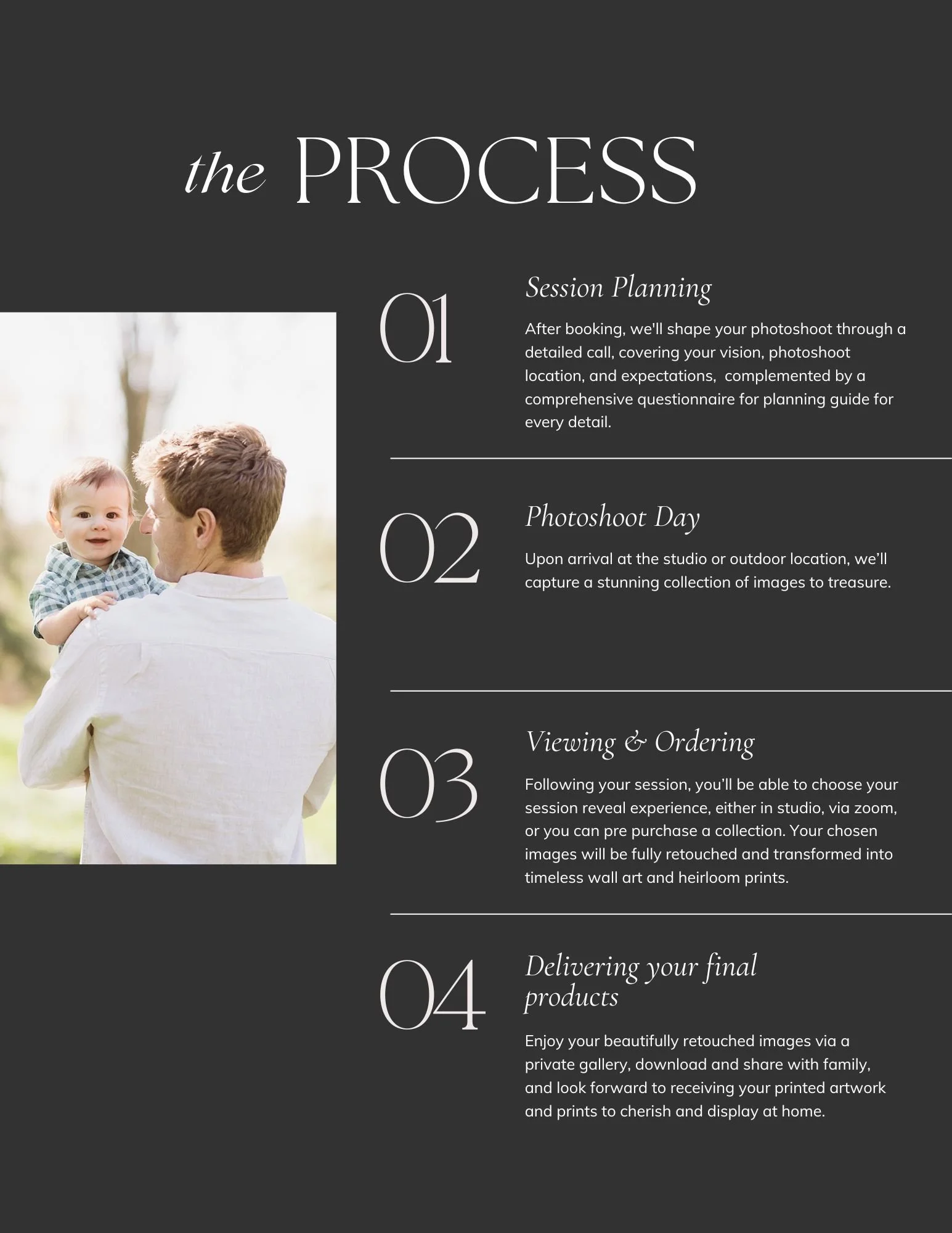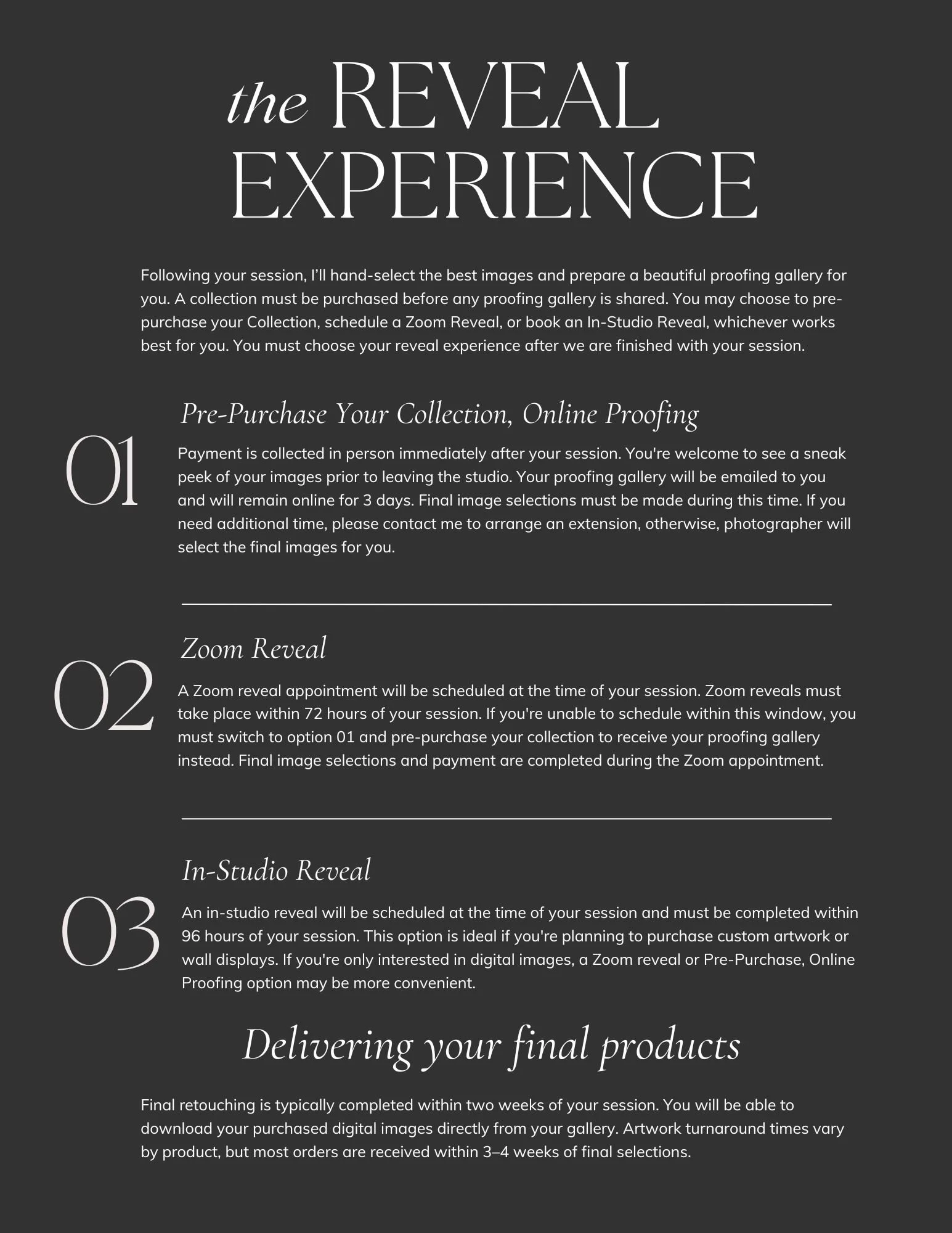 Once you’ve completed the questionnaire below, I’ll have everything I need to begin designing and styling your session. If you would like I can send you a few preview images of the setup and wardrobe selections 1-2 nights before your session so you’ll know exactly what to expect.